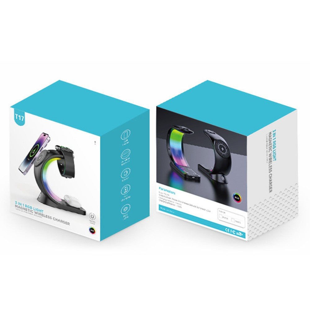 T17 3-in-1 RGB Light Magnetic Wireless Charger for iPhone 12 / 13 / 14 / 15 Series Desktop Fast Charging Stand